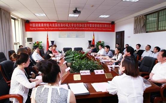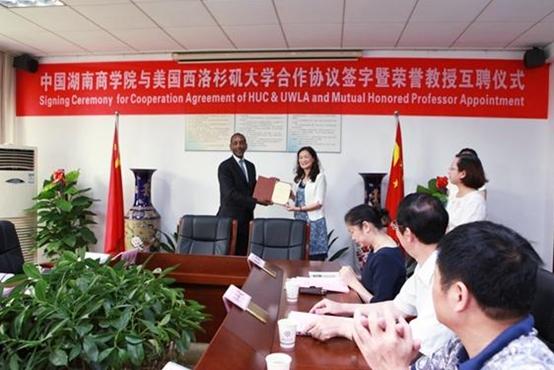 A meeting between University of West Los Angeles (UWLA) and Hunan University of Commerce (HUC) was held on June 1st in HUC office building with HUC deputy president Wang Minggao as the host. During the meeting, the two universities exchanged ideas and shared experiences on international education program development and signed a cooperation agreement.