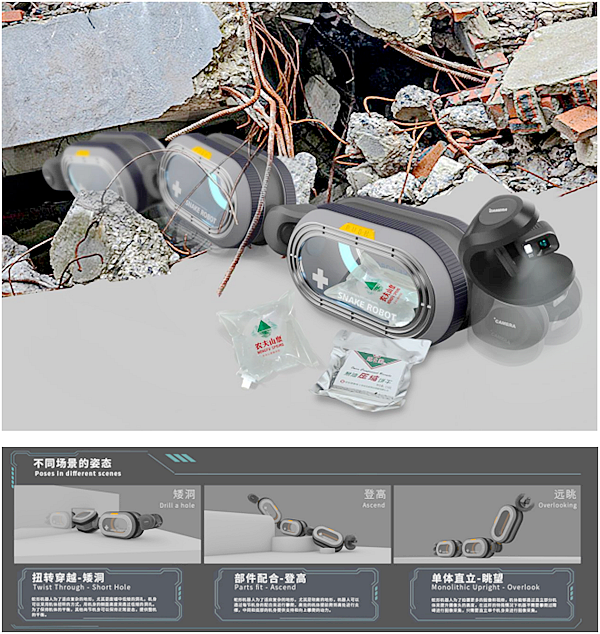 Design Description for the Snake-shaped Feeding Robot: In the event of an earthquake or a building collapse, some victims may become trapped deep within the rubble with no means of communication with the outside world. Traditional search and rescue equipment is often too bulky to reach deep into the rubble, making it difficult for rescue personnel to obtain information from inside the debris. Even small search and rescue dogs that can enter the rubble face the constant danger of secondary collapses. This snake-shaped feeding robot is characterized by its compact size and flexibility. Its mobility and maneuverability far surpass traditional search and rescue equipment. It can replace search and rescue dogs by entering deep into the rubble. The robot body features a 360-degree camera with adjustable lighting, allowing it to transmit video data from inside the rubble to the outside. The device can transport essential first aid supplies, as well as food and water. Its voice communication function can establish contact with survivors inside the rubble, providing the greatest possible hope of survival for those deep within the debris.