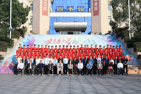 The attending chief leaders, academic mentors, and all Hong Class students took a commemorative group photo on the Jinjie staircase in the library.