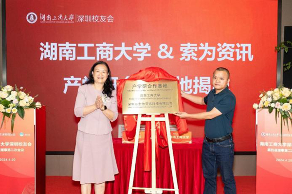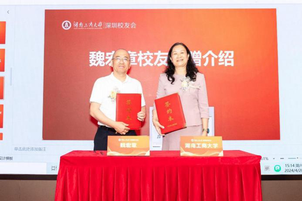 On the afternoon of April 20, the Wei Hongzhang Alumni Donation and Industry-Education-Research Cooperation Base Unveiling Ceremony was held in Shenzhen The ceremony was attended by Chen Xiaohong, Secretary of the CPC HUTB Committee, Director of Xiangjiang Laboratory, and Academician of the Chinese Academy of Engineering (CAE), Gan Dejian, Member of the CPC HUTB Committee and Vice President of HUTB, Xia Jichun, Executive Vice President of the Alumni Association, Li Hu, Chairman of Shenzhen Techwinsemi Technology Co., Ltd., a company listed on the Main Board, Wei Hongzhang, co-founder of Shenzhen Techwinsemi Technology Co., Ltd. and an alumnus from the 1985 class of the Finance and Accounting major, and Xie Xianhua, an alumnus from the 2000 class of the Administrative Management major and Executive Director of Shenzhen Suowei Information Technology Co., Ltd. Approximately 100 people attended the event, including leaders from relevant functional departments and secondary schools of the university, leaders from relevant departments of Xiangjiang Laboratory, representatives from collaborating companies, and representatives from alumni associations in the Guangdong-Hong Kong-Macao Greater Bay Area. Representatives from the alumni associations in the Greater Bay Area, such as Lei Liang and Xie Xianhua, Vice Presidents of the Shenzhen Alumni Association, Liu Yanbo, President of the Zhuhai Alumni Association, You Xiongzhi, President of the Dongguan Alumni Association, and Wang Chaoxi, Executive President of the Guangzhou Alumni Association, delivered speeches and engaged in discussions.