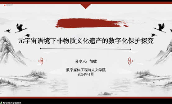 胡敏博士作了《元宇宙语境下非物质文化遗产的数字化保护探究》主题发言,介绍了非物质文化遗产保护的基础背景,国家相关政策、困境等。探讨了赛博空间、元宇宙等技术迭代与非物质文化遗产保护数字化手段的发展现状并结合实际案例介绍了非遗保护与元宇宙技术目前的实际应用情况以及非遗传承教育通过元宇宙技术的实现路径。同时对元宇宙传承非遗与人的主体性悖论问题进行辨析。