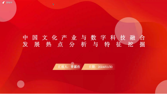 曹露浩博士作了《中国文化产业与数字科技融合发展热点分析与特征挖掘》主题发言,从政治、经济技术层面介绍了中国文化产业与数字科技融合发展的背景,并探讨了数字化转型、数字科技技术与文化产业融合的融合模式、相关理论支持与发展特征以及前景展望与建议。