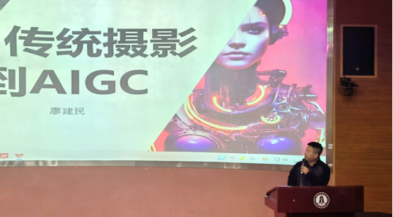 廖建民副教授则以《从传统摄影到AIGC》为题,回顾了影像技术从暗箱到AI的图像史演进,对比了布列松“决定性瞬间”与AI“算法瞬间”的异同,引发对真实性、原创性与艺术价值的当代思考。他强调,技术虽不断迭代,但人文精神与艺术表达的核心始终不变。