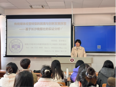 讲座主题聚焦于传统媒体经营转型的困境与创新发展探索。何芳明教授先从当前主流媒体的普遍困境入手,如经营结构单一、整体营收下坠、用户零散流失等问题,讲述其系统性改革的必要性与媒介深度融合的迫切性。之后,以长沙晚报为例,从“价值链、供应链、产业链”三链阐述传统媒体如何真正从”内容生态”“传播逻辑”“文化科技”“资源整合” 等方面的自主创新来助力经营转型,并链接当前各行业现存实例,佐证经营方略,预判未来传媒走向。