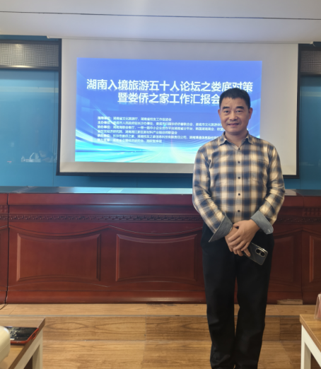 王佩良教授作题为《湘中蚩尤龙脉名人资源开发与入境旅游品牌培育研究》的主题发言,系统梳理娄底市域丰富深厚的人文底蕴,解读吸引境外游客前来娄底旅游的文化元素,提出依托王夫之、曾国藩、蔡和森、王憨山、梁稳根等世界级名人效应,打造串联南岳、九峰山、龙山、大熊山的低空寻根旅游热线,举办具有国际影响力的女杰文化节、梅山武术节、新化山歌节、辣酱美食节以及糯文糯语字牌扑克大赛,将娄底打造成令全球人们向往的精神家园和寻根旅游目的地。