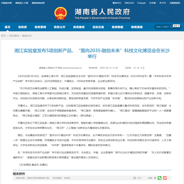 会前,与会嘉宾观看了我校师生表演的中华优秀传统文化节目,充分展现了湖南工商大学和湘江实验室拼搏奋斗、蓬勃向上的精神面貌,彰显了“人工智能+”“文化+科技”的特色亮点。 据悉,“面向2035·融创未来”科技文化博览会(2025年科技节)为期3天,共包含开幕式、学术研讨会、湖南省大学生创业导师校园行暨创业名师大讲堂(人工智能专场)、元创未来Ⅲ—“以元宇宙之力探索世界”主题展、“忠昭日月 气壮河山”纪念抗日战争胜利八十周年何继善院士书法作品展、“四算一体”联盟企业合作成果展、“AI织梦”服装秀、“人工智能与城市更新”分论坛、“智汇湘江 锦绣工商”中华优秀传统文化集市、人文工商讲坛、校友企业家创新创业分享、湘江学者论坛、科技创新成果路演及合作对接活动、AI+创新创业大赛暨“加速计划”项目路演、“雏鹰计划”大学生创新创业项目路演、湘商文化主题展、“面向2035·融创未来”音乐会、“融创未来·青春焕彩”学生节等20多个活动单元,部分主题展览将面向师生长期开放。 (文/张高阳 杨水林 凌雅琴 彭昌君 田玫蕾 图/涂画 校融媒体中心) 相关新闻