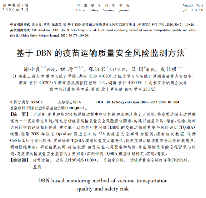 2020年7月,我院谢小良教授团队刊发在《中国安全科学学报》的论文“基于DBN的疫苗运输质量安全风险监测方法”,以OpenLaw官网上公布的328起疫苗案件为样本,分析涉及疫苗运输过程的质量风险来源,统计样本风险源数据,系统分析了疫苗运输质量安全影响因素的风险致因,遴选了26个主要的风险指标作为网络节点,建立基于DBN网络的TQSRA模型和算法。