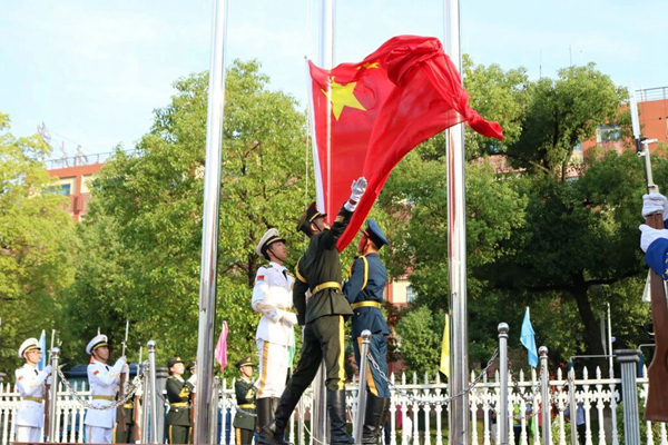 The opening ceremony commences with a solemn flag-raising ceremony. All faculty and students stand in respectful silence, singing the national anthem and saluting the rising flag.