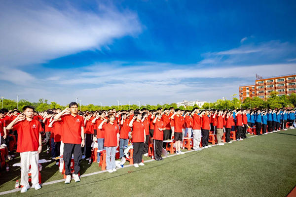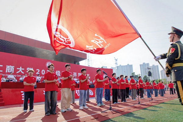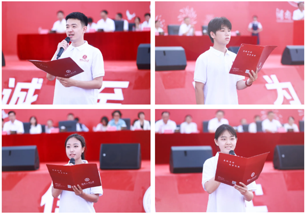 Under the leadership of Wu Chenyi, an undergraduate student from the School of Management Science and Engineering, all freshmen raise their right fists and solemnly pledge: "We will bear in mind the HUTB motto, shoulder the mission of our times, and set lofty aspirations. We will respect teachers and traditions, abide by the law, diligently study, seek truth, and innovate. We will take deep roots and study assiduously; grow upward and pursue excellence. We will live up to our youth, our era, and our motherland. We assure the CPC of our commitment; strengthening the nation is our promise!"