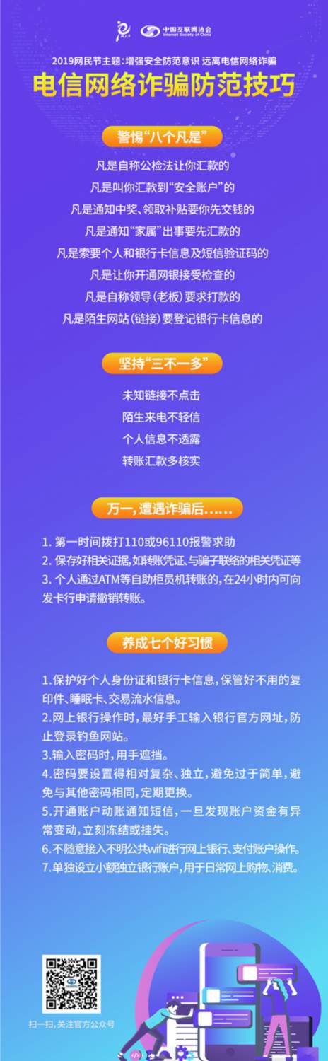 今天是「中国网民节」,祝全国的网民朋友们节日快乐!随着互联网的不断发展和普及,为我们的生产生活带来了很多便利,与此同时电信网络诈骗也让人防不胜防,轻则遭受财产损失,重则威胁到人身安全。那么,应该如何防范电信网络诈骗呢?以下小妙招或许能帮到你!